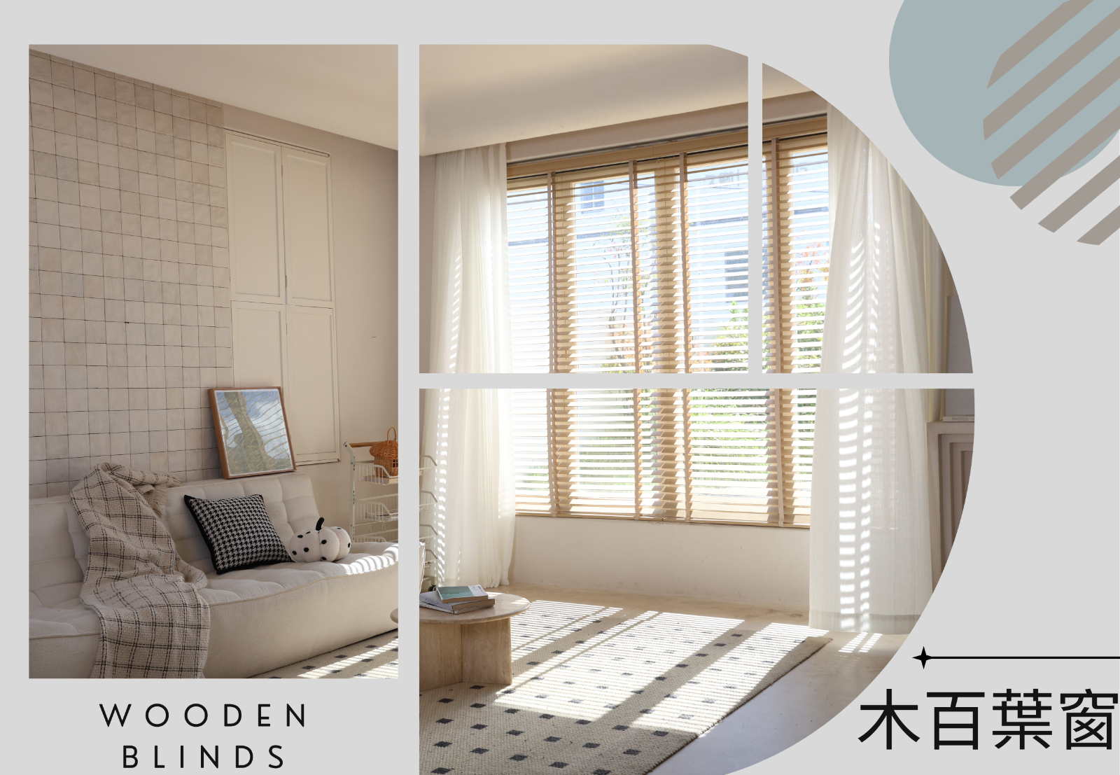木百葉的優點 :木質肌理細緻,提升整體空間質感與設計完成度 • 葉片厚實,遮光與隱私控制效果佳 ,材質選擇多元(防水塑鋁、皮革、緞木、竹木、白木、桐木等),可依空間條件與風格需求,彈性搭配不同材質