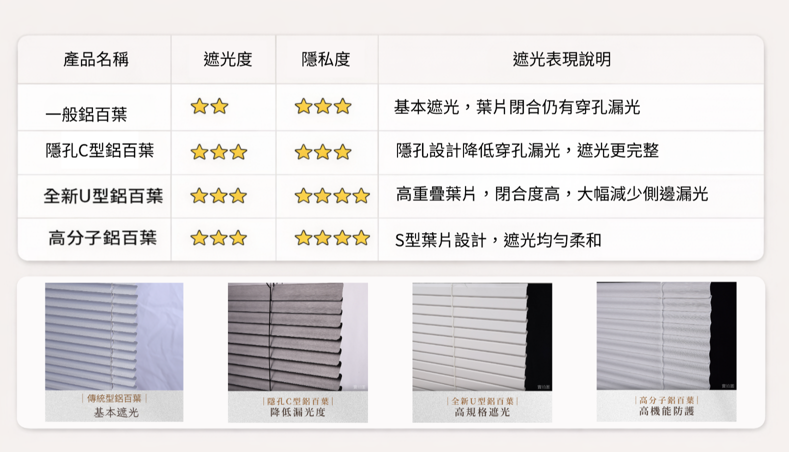 我們的鋁百葉提供 C 型與 U 型葉片設計,可依不同空間需求選擇。 C 型葉片 具備良好通風與採光調節效果;U 型葉片葉片重疊度高,閉合更緊密,遮光效果更佳。 全系列採用 高品質鋁合金製成,輕量耐用、不易受潮變形,特別適合台灣氣候。葉片角度可靈活調整,有效控制光線,同時維持室內通風不悶熱。 隱孔設計鋁百葉 可減少傳統孔洞漏光問題,在保留通風性能的同時,遮光表現更加完整。簡潔俐落的外觀,無論居家或商業空間,皆能兼顧實用與美感。