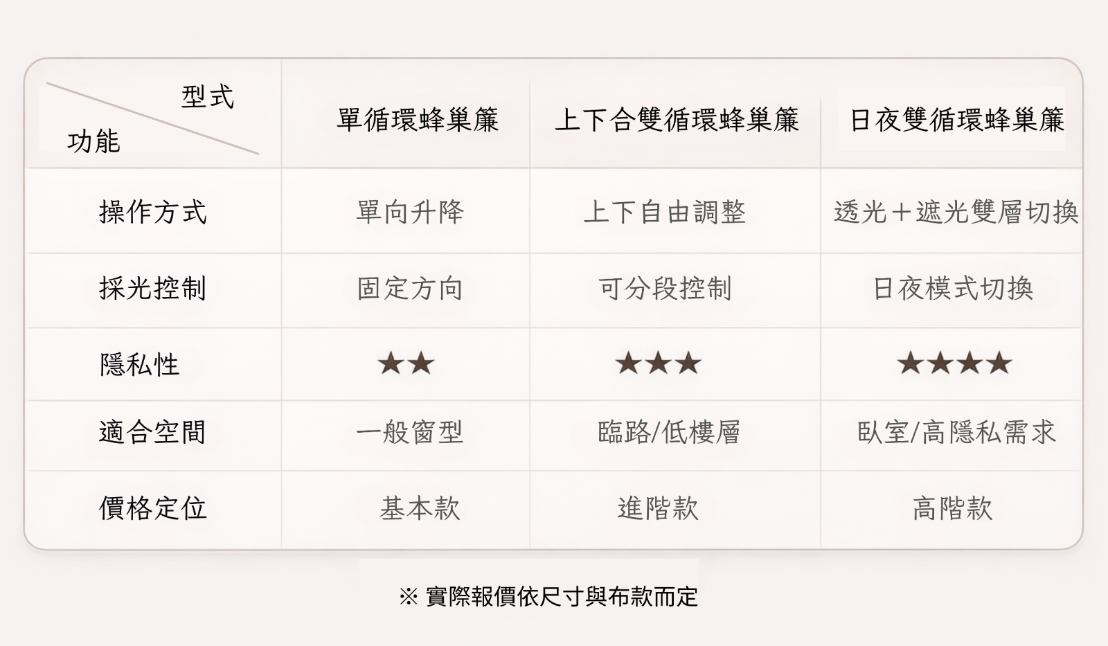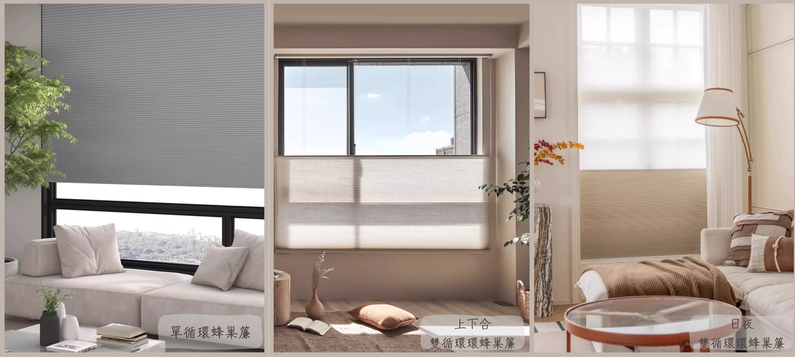 蜂巢簾可做單循環式、上下合式與日夜簾式,可依需求調整光線與透視程度,操作簡單且適用於各種窗型。