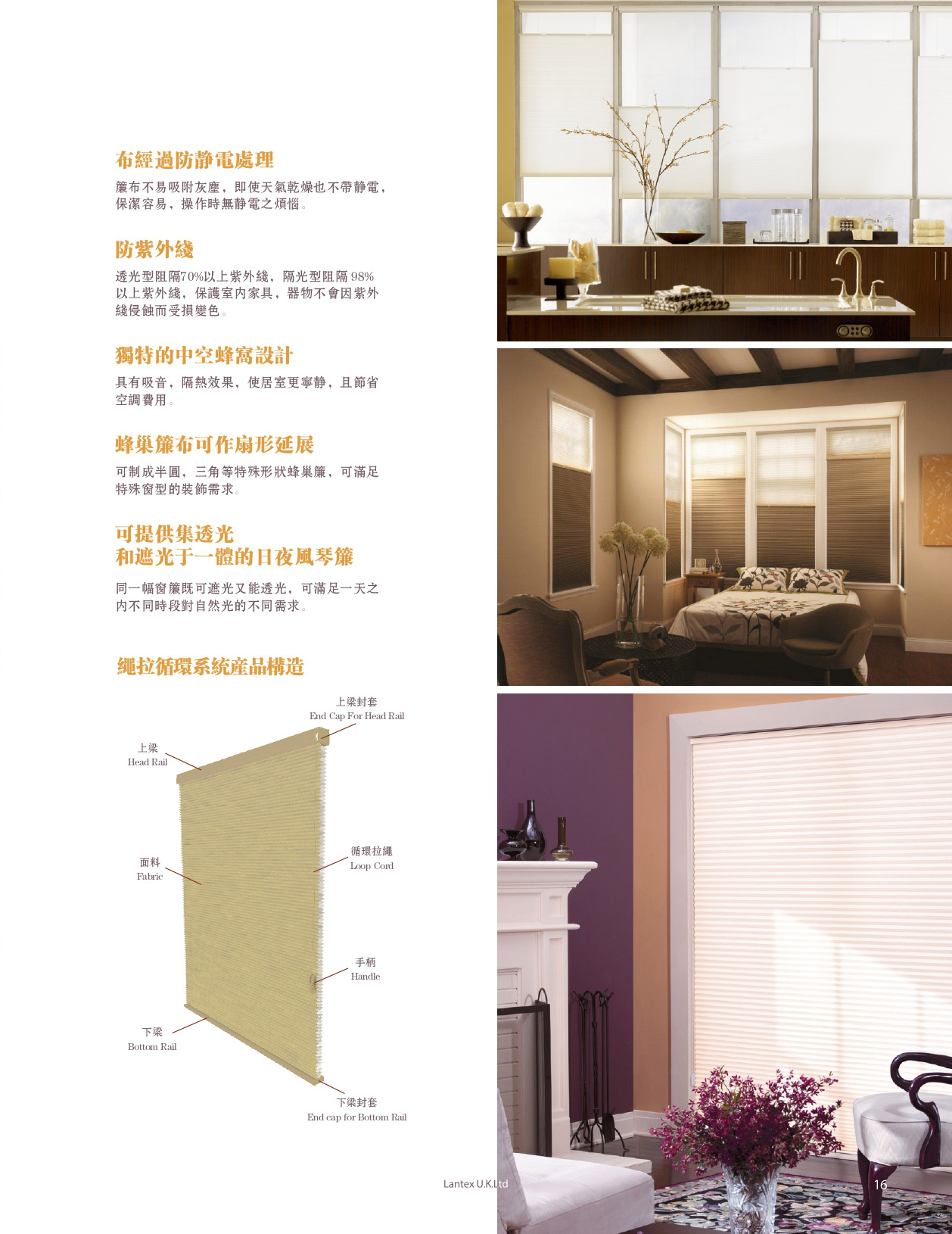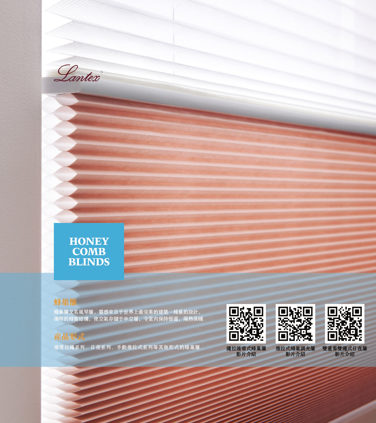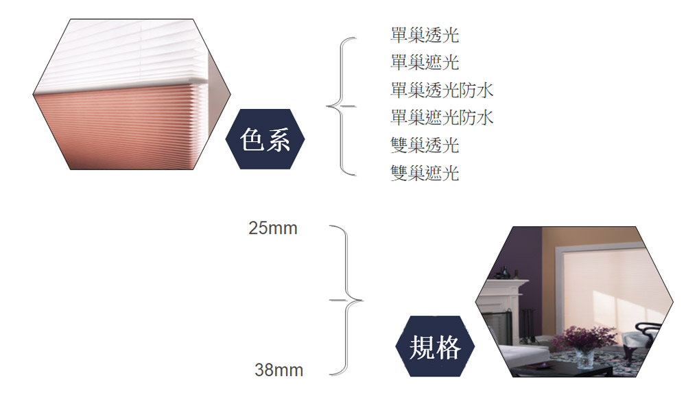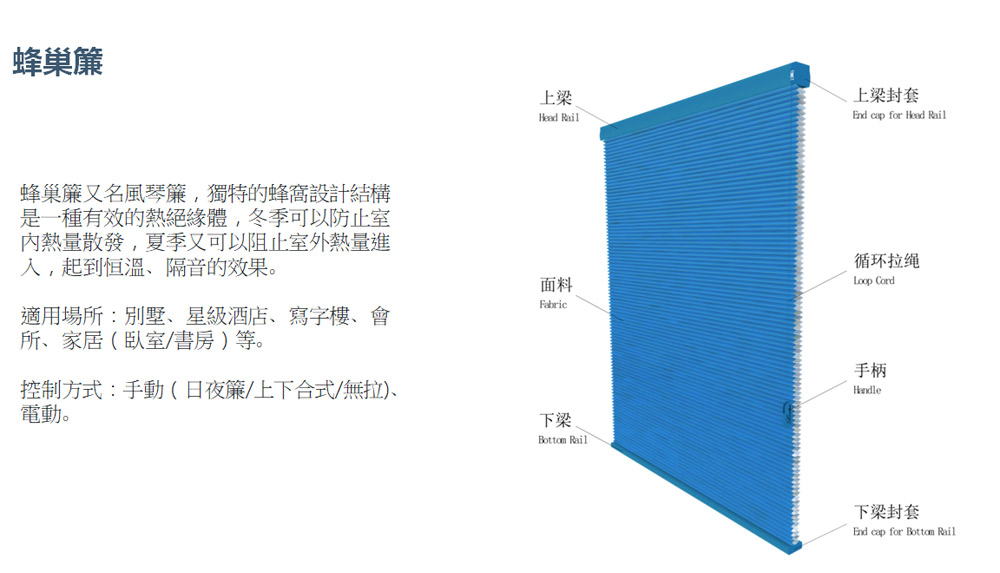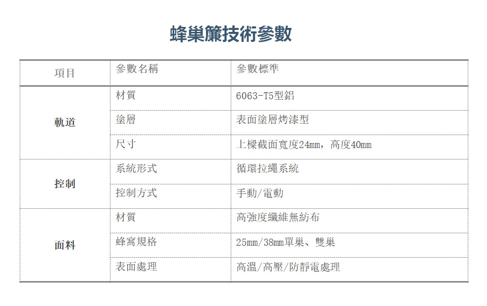 獨特中空蜂窩結構設計,吸音隔熱,阻隔紫外線,面料防靜電處理不易吸附灰塵。 可使用2.5cm單蜂巢面料以及3.8cm面料雙蜂巢面料。※單循環蜂巢簾可做電動形式,電壓110-220V。