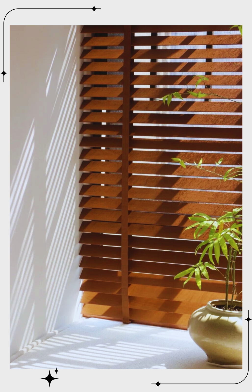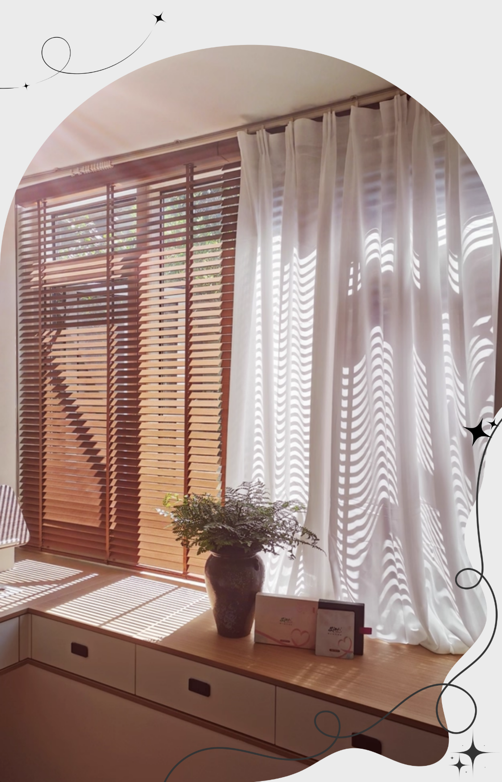 木百葉是一種以天然木材或仿木材製成的葉片式窗飾,具有溫暖自然的質感,能為空間增添柔和、舒適與高級的氛圍。