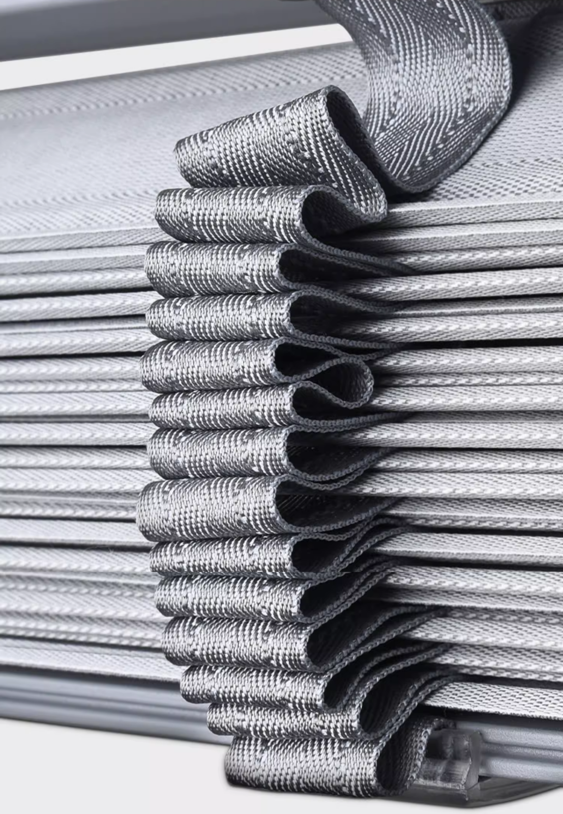 布百葉將柔軟布料與百葉窗的可調控結構結合,透過調整葉片角度,即可靈活控制光線、視線與隱私。