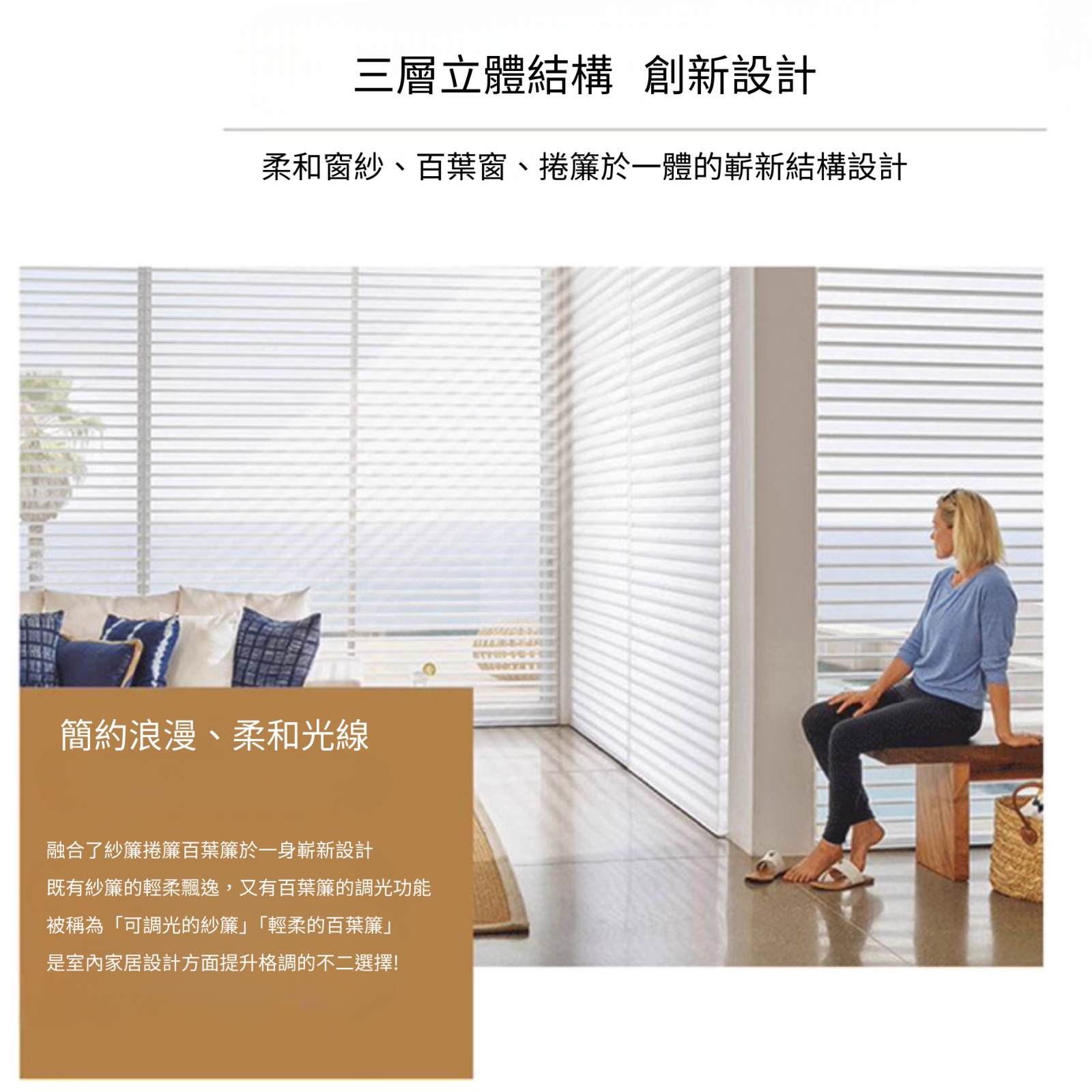 絲柔百葉融合了 百葉簾、調光簾、蜂巢簾與捲簾的優點,外型簡潔時尚,